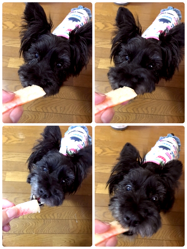 まず香りを嗅ぎ、ぺろっと舐めてみてあーんとお口を開けてから目をひんむいて食らいつく!